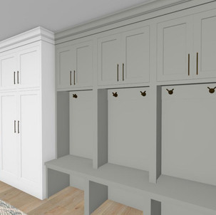 A few tweaks were made to the final design, such as eliminating the glass in the cabinets and scaling down the mudroom, but having the plan nailed down helped them make these decisions. Did you know that adding glass to cabinets is typically a few modifications to the cabinet, resulting in hundreds of dollars in upcharges? Seems expensive until you add it up: they need to prep the door differently for glass, add the glass material, and finish the interior of the cabinet and change out the wood shelves for glass shelves. And in many cases, we add lights to those cabinets, which is an additional electrical upcharge as well. If you do that to multiple cabinets, the price of your cabinet order can take leaps and jumps quickly.