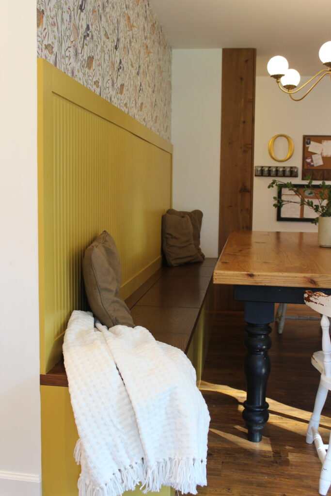 When we tighten up the bathroom, this provided the perfect amount of space for a pantry! When we removed the old chimney and reversed the laundry room layout, that funky angled wall gave purpose to a coat hook wall. When we opened up the dining room and did a built-in bench for the table, we created enough room for the island to gain in length, which triggered an additional countertop by the front door making the overall kitchen very functional with storage, use and style. The charm of the finishes in each space is what makes this eclectic space just shout farmhouse!