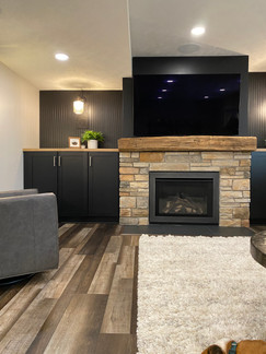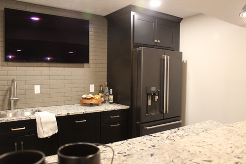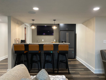 The clients wanted a space for watching games, gathering and entertaining friends, while keeping the space open as much as possible. They planned on adding a sound system in the tv entertainment area, with areas of seating for as many as possible without crowding, a full yet small kitchenette, storage for kids toys and games, a full guest ensuite for family and friends and all of this with a different vibe from their upper levels to create a unique space for everyone to hang out in.